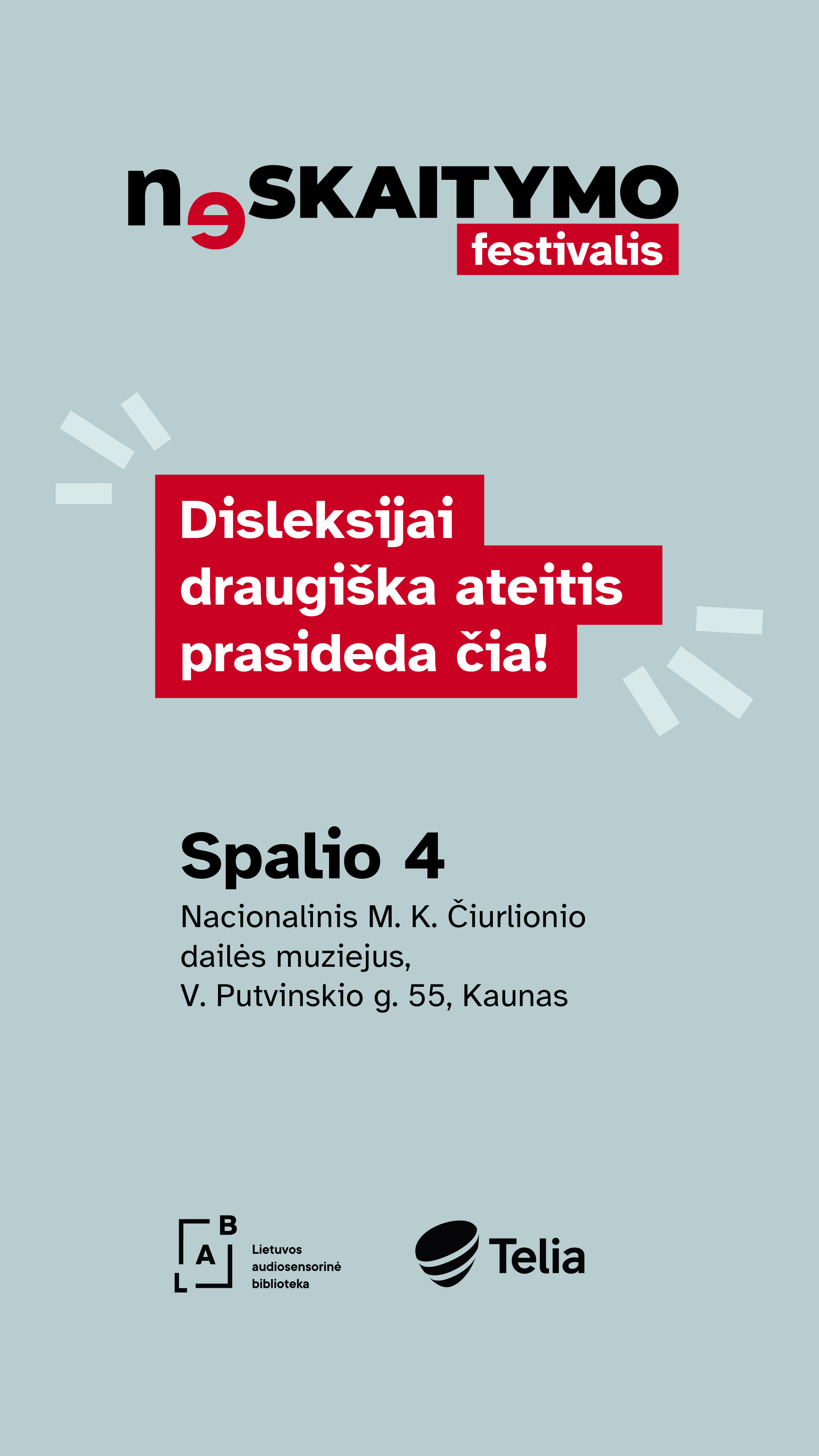 „Nėra vieno teisingo būdo patirti pasaulį, kiekvienas iš mūsų jį suvokiame savaip. Todėl svarbu pripažinti, kad ne visiems įprasti mokymosi metodai tinka vienodai. Disleksija – tai neuroįvairovės dalis, kurią turime ne tik suprasti, bet ir mokėti atliepti tiek mokyklose, tiek darbe ar paslaugų srityje, – sako „Telia Lietuva“ įtraukties ir įvairovės partnerė Julija Markeliūnė. – Remdami Neskaitymo festivalį jau trečius metus iš eilės siekiame padėti visuomenei geriau pažinti įvairius pasaulio patyrimo būdus ir kurti aplinką, kurioje skirtumai būtų ne kliūtis, o vertybė.“
